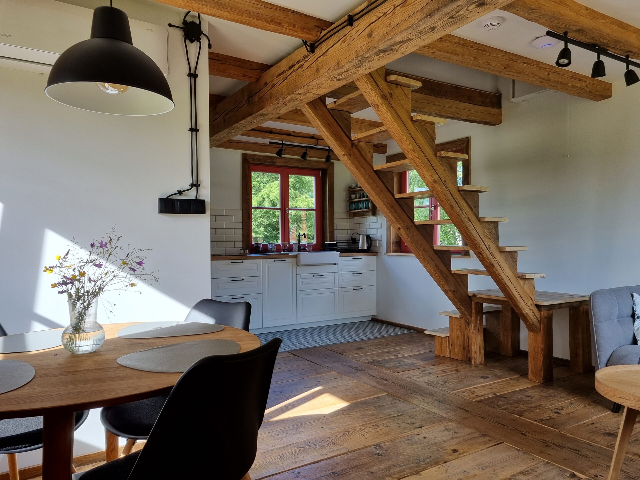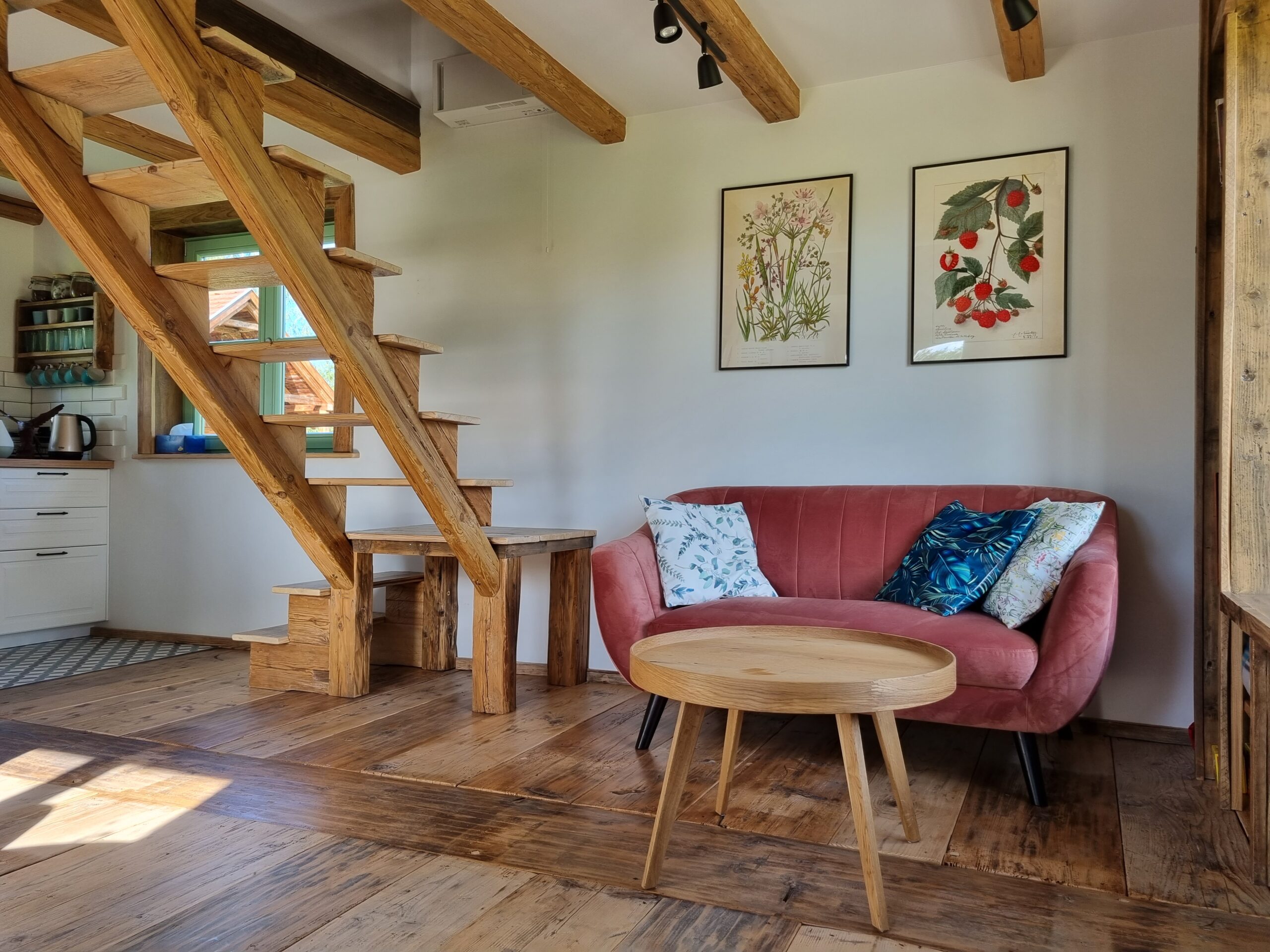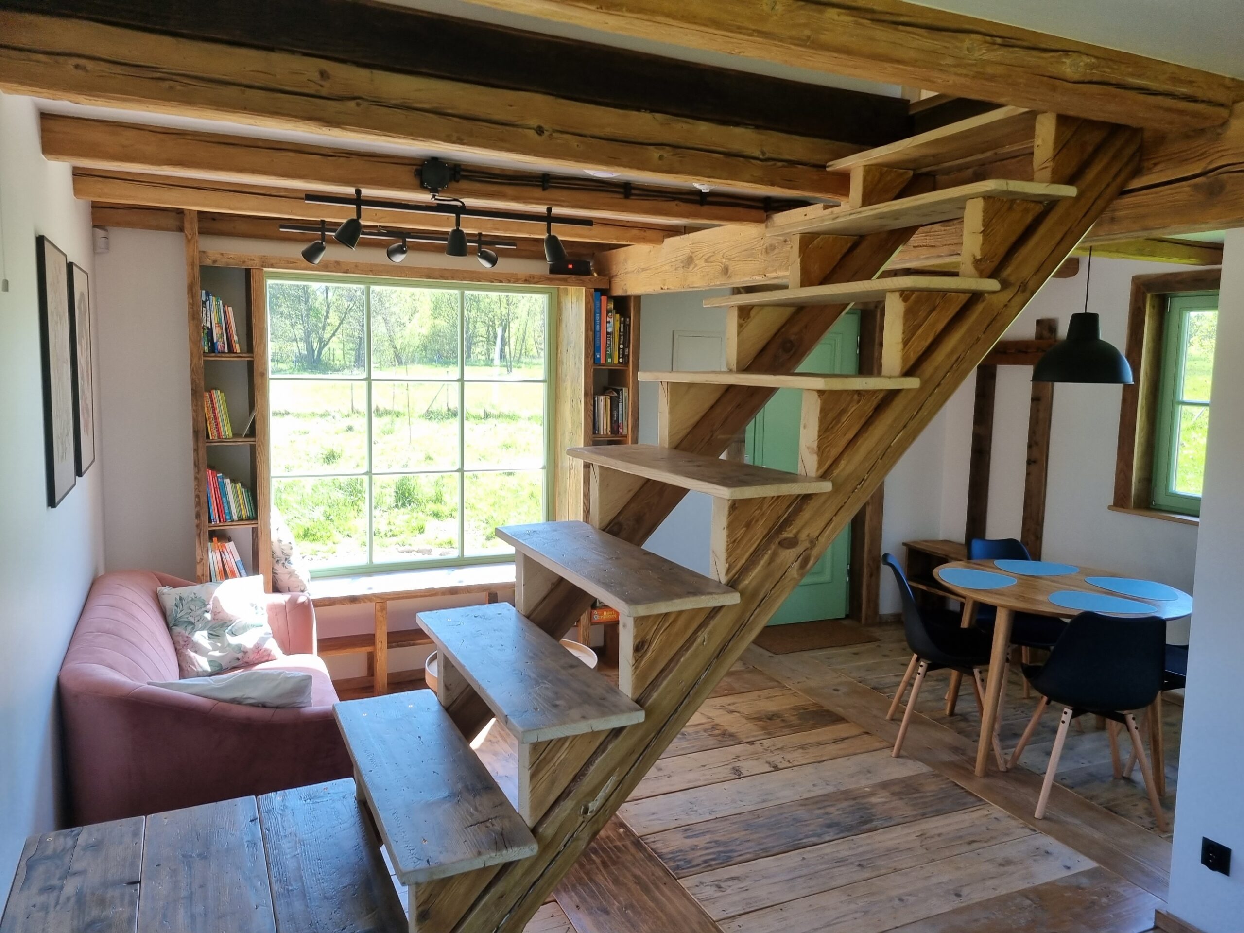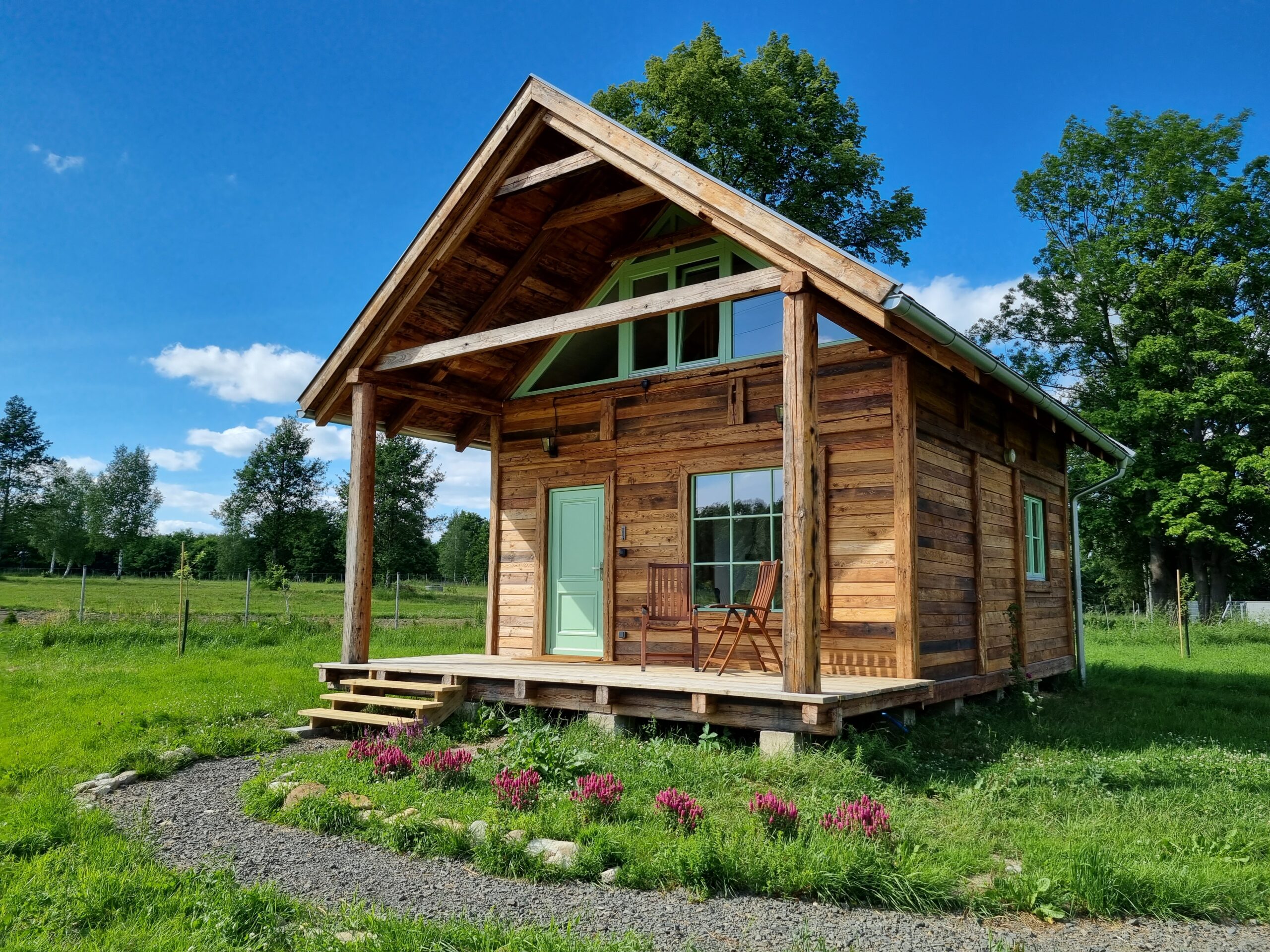 Zależało nam na stworzeniu miejsca, które wpisze się charakterem i wyglądem w okolicę. Nasze domki powstały z projektu rysowanego na kartce papieru, rękami lokalnego stolarza. Do budowy wykorzystaliśmy materialy z recyklingu – mamy starą dachówkę i podłogę, którą wyszukaliśmy na drugim końcu Polski, a konstrukcja domków jest z ponad stuletniego drewna.