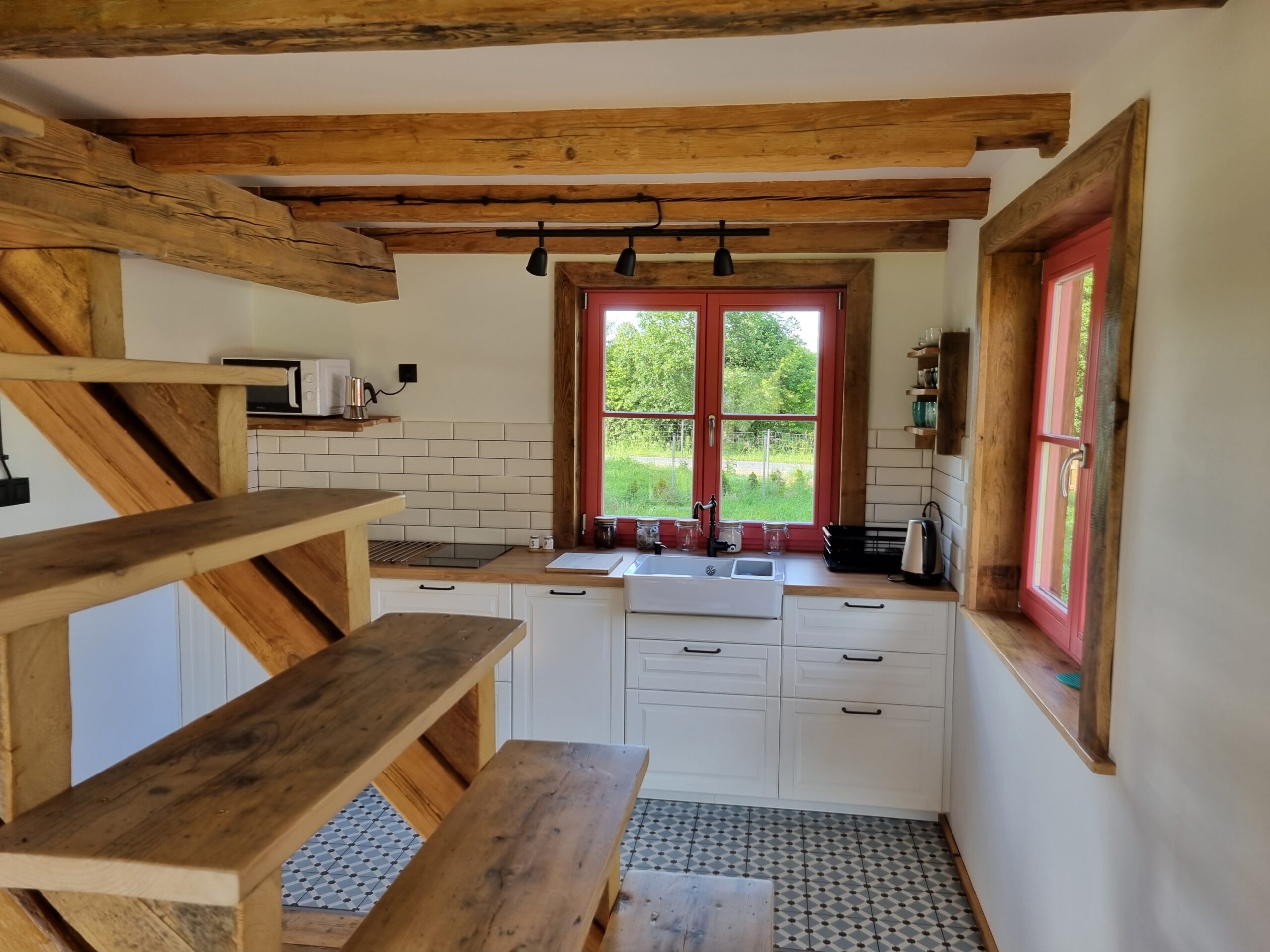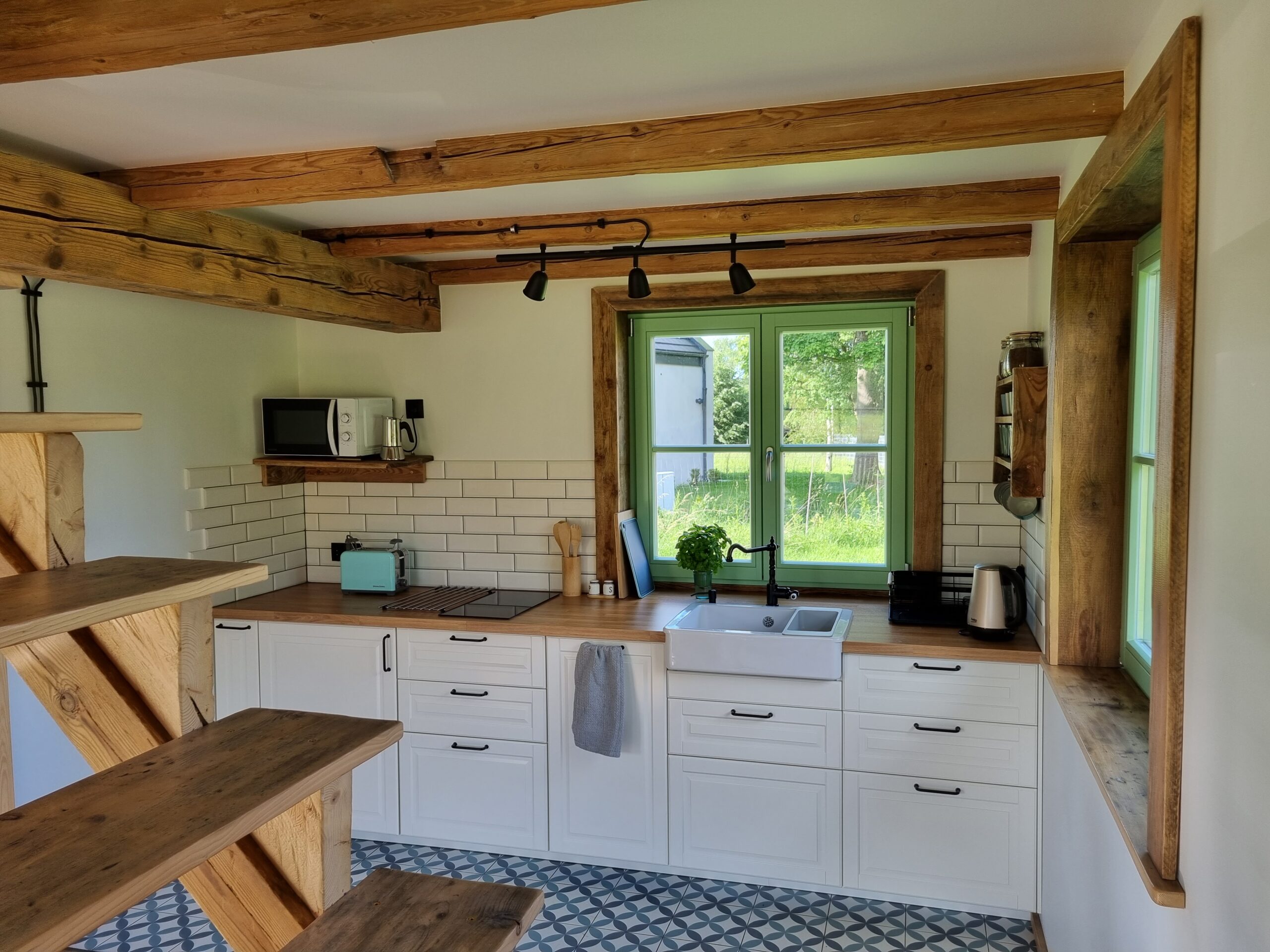 Kuchnia jest wyposażona w kuchenkę indukcyjną 2-palnikową, lodówkę, zmywarkę, kuchenkę mikrofalową, toster, czajnik elektryczny, kawiarkę, naczynia do gotowania i serwowania.