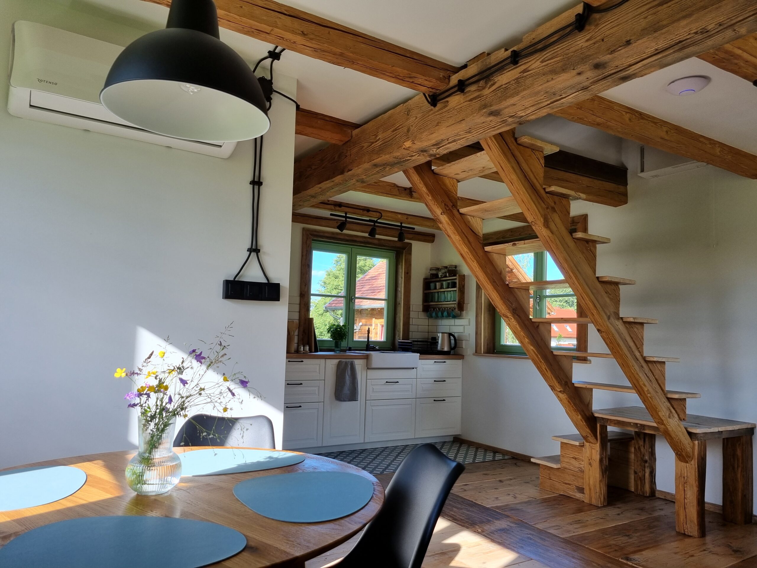 Domki są jasne i ciepłe (ogrzewane pompą powietrze/powietrze, dodatkowo w łazience jest ogrzewanie podłogowe oraz grzejnik elektryczny).